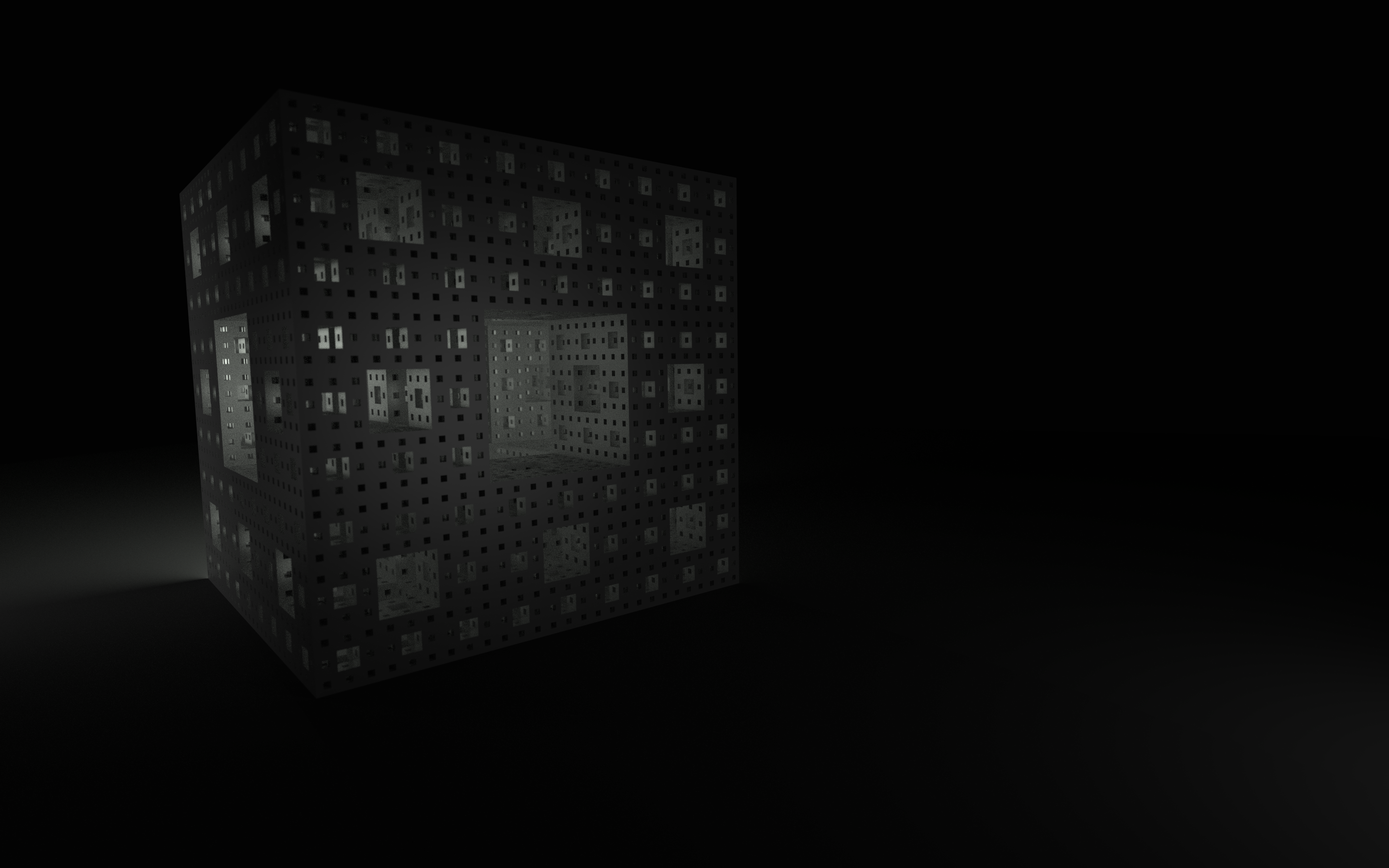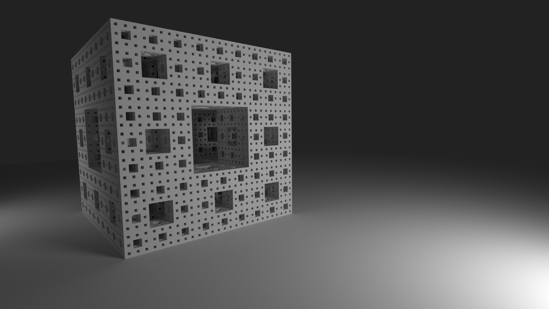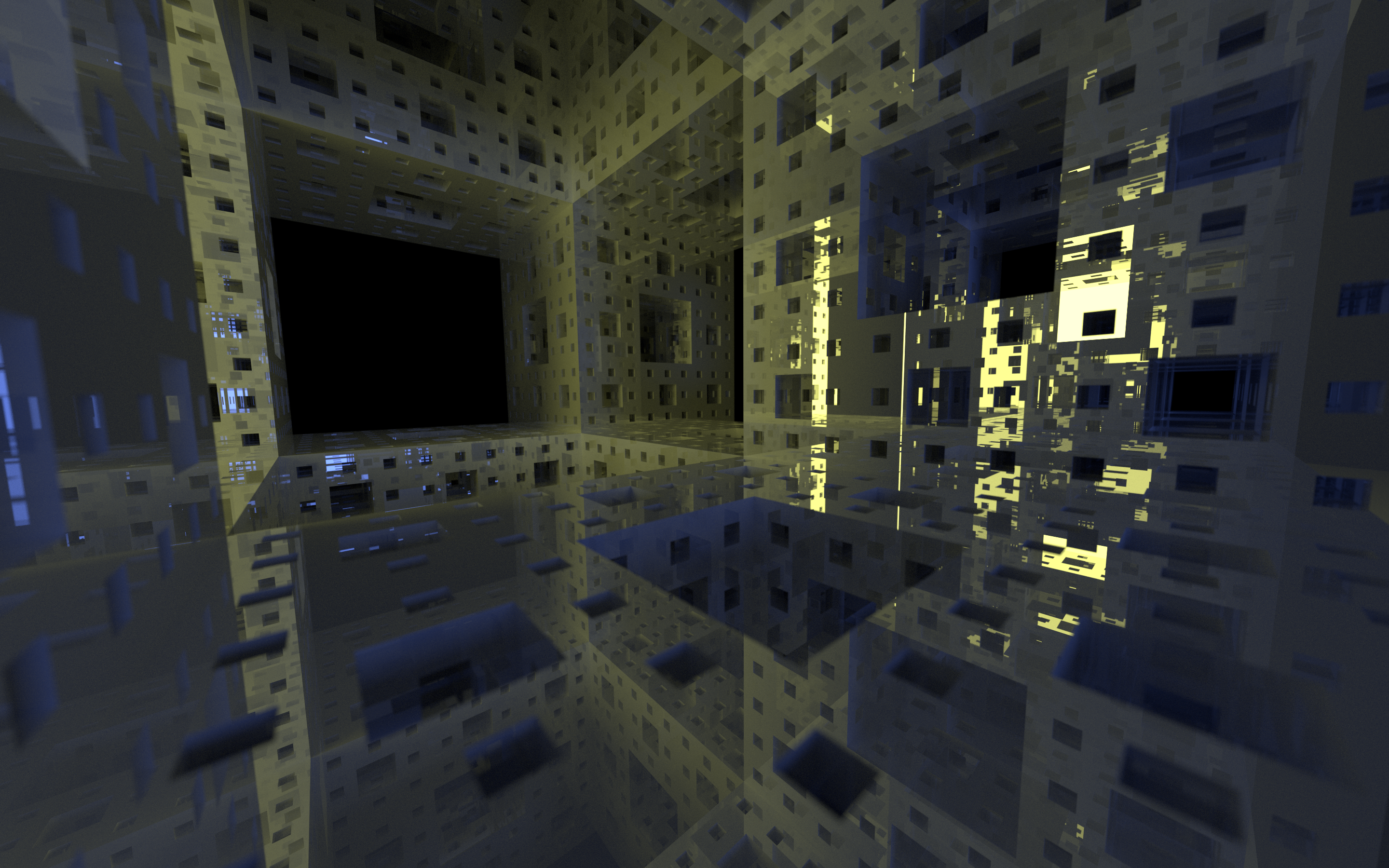 I was always very fond of the Menger sponge. I built my level 4 sponge manually, not by using a recursive script. You can find a Python script for blender here. Here you will find some renders. I started with a simple lighting, did some reflection afterwards and finally changed the material to glass. Finally I changed the lighting to a two colored one and moved the camera inside. You can play yourself – take the blend file from here (nearly 2,5e6 triangles, 113 MB).